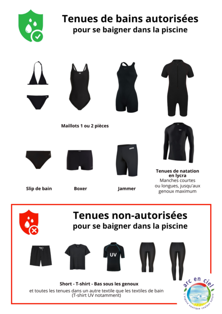Pour des raisons d’hygiène et de qualité de l'eau pour les baigneurs, seuls les vêtements destinés uniquement à la natation sont acceptés dans les bassins.